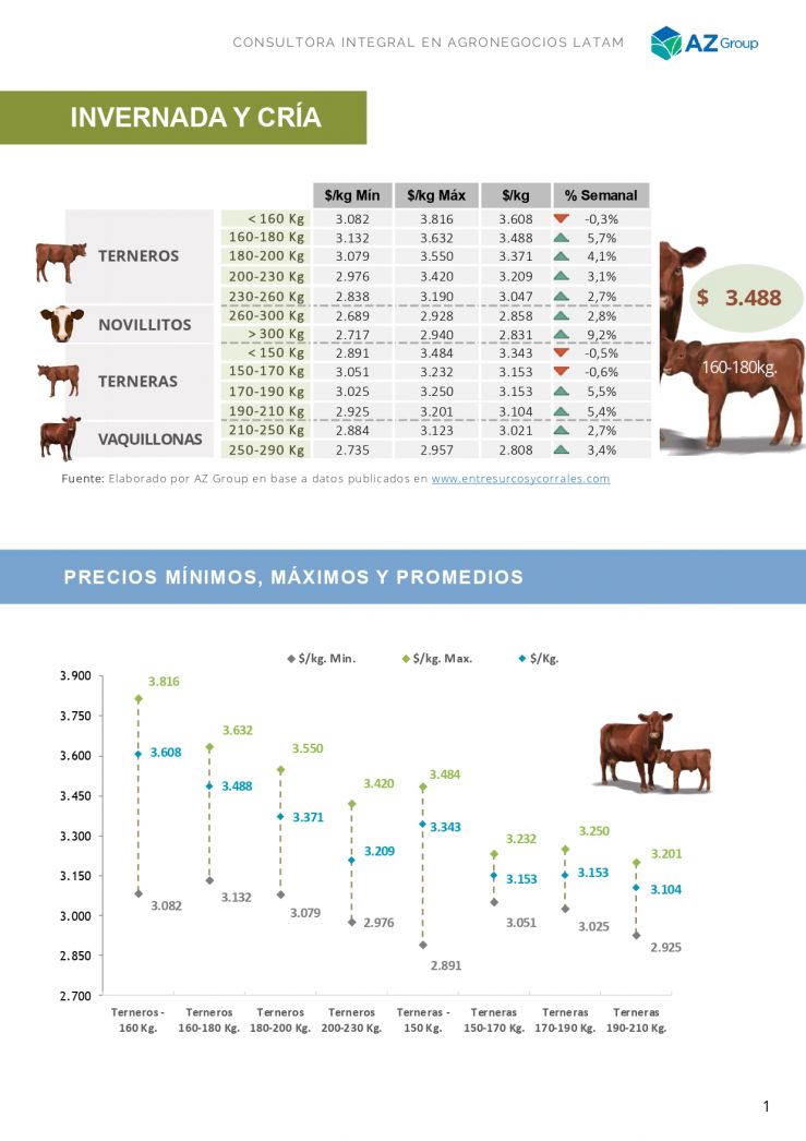 Nueva semana de recuperación de precios para la invernada. Por los terneros de 160-180 kg. se llegaron a pagar hasta $3.632 /kg., los promedios se ubicaron torno a los $3.488/kg., un +5,7% con respecto a la semana pasada.