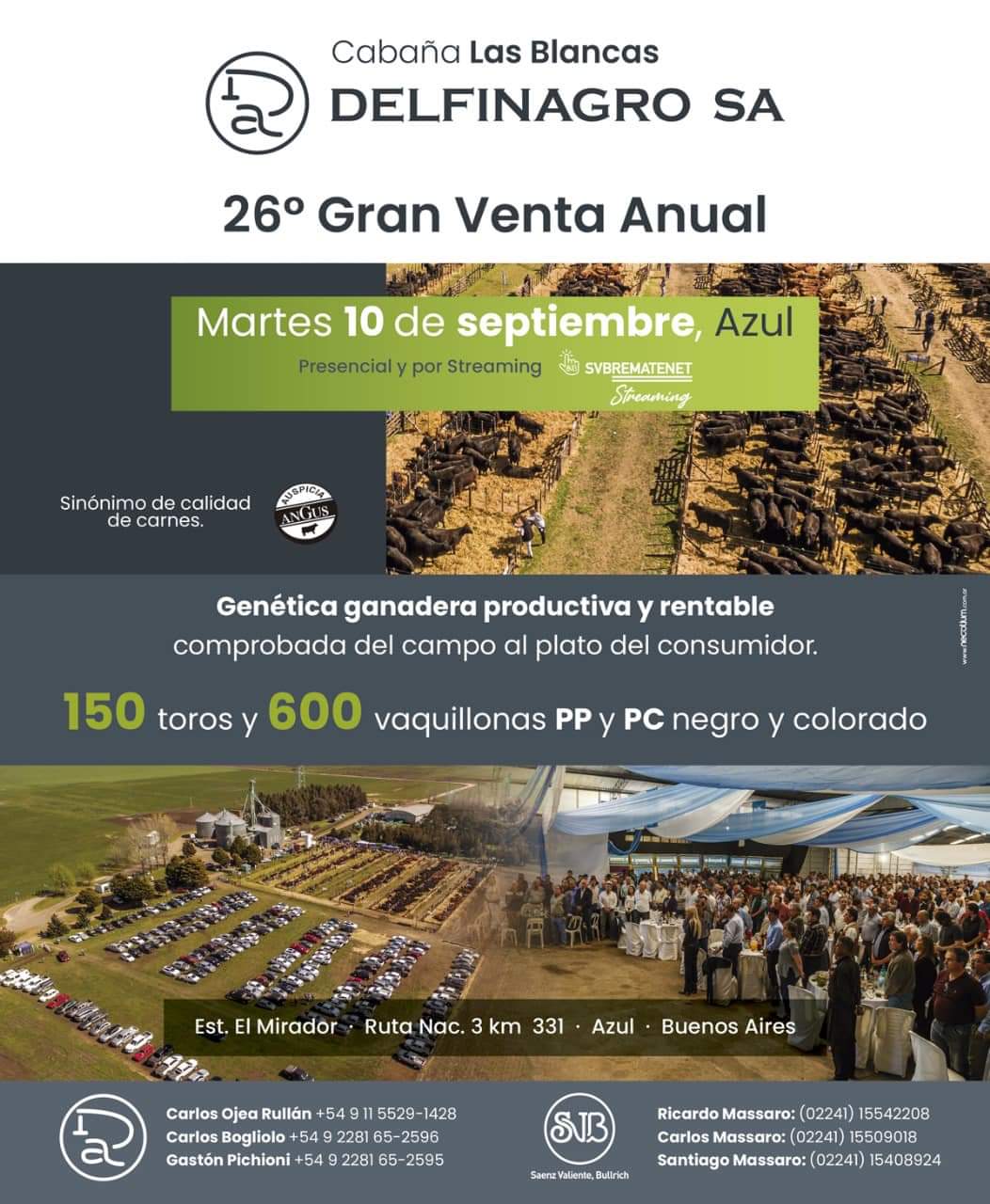 El 10 de septiembre, Azul será el epicentro de la genética ganadera productiva y rentable en el 26° Gran Venta Anual de Delfinagro SA. Con más de 150 toros y 600 vaquillonas PP y PC negro y colorado, este evento es una cita obligada para los productores que buscan calidad asegurada, desde el campo hasta el plato del consumidor. El remate se realizará en la Estancia El Mirador, bajo la prestigiosa consignataria Saenz Valiente, Bullrich (SVB), y contará con opciones de participación tanto presencial como por streaming. Una oportunidad única para adquirir lo mejor en genética ganadera.