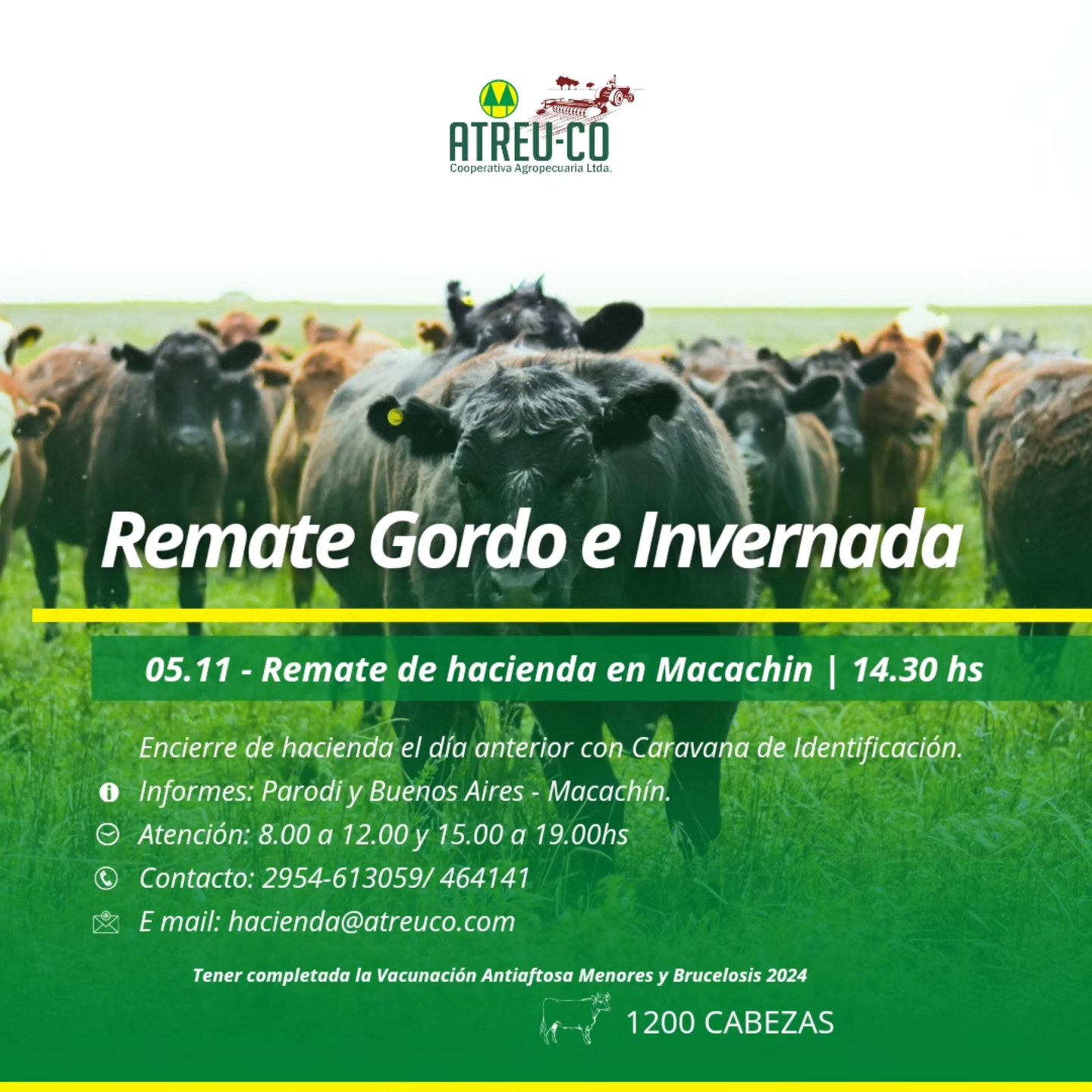 Este martes 5 de noviembre, en Macachín, La Pampa, ATREU-CO llevará a cabo uno de los eventos más destacados para el sector ganadero: un remate feria de Gordo e Invernada con 1.200 cabezas. Este remate se convierte en una excelente oportunidad para los productores de la región que buscan aprovechar las mejores condiciones del mercado y con la posibilidad de seguirlo en vivo a través del streaming de «De Frente al Campo». ATREU-CO se ha posicionado como un referente confiable en la consignación de hacienda, ofreciendo en este evento animales con Vacunación Antiaftosa Rodeo General 2024, garantizando seguridad y calidad.
