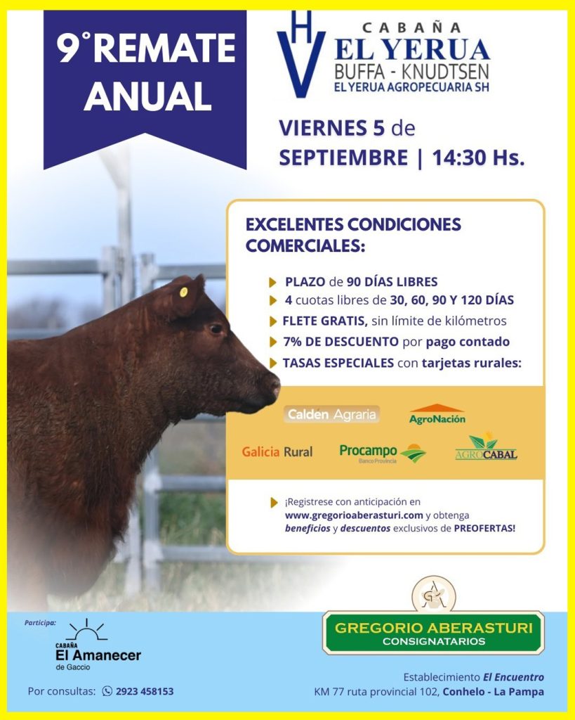 El viernes 5 de septiembre de 2025, Cabaña El Yeruá —Buffa-Knudtsen— llevará adelante su 9° Remate Anual en el Establecimiento El Encuentro (Km77, Ruta Provincial 102, Conhelo, La Pampa). La subasta estará a cargo de Gregorio Aberasturi Consignatarios, con modalidad presencial y streaming.