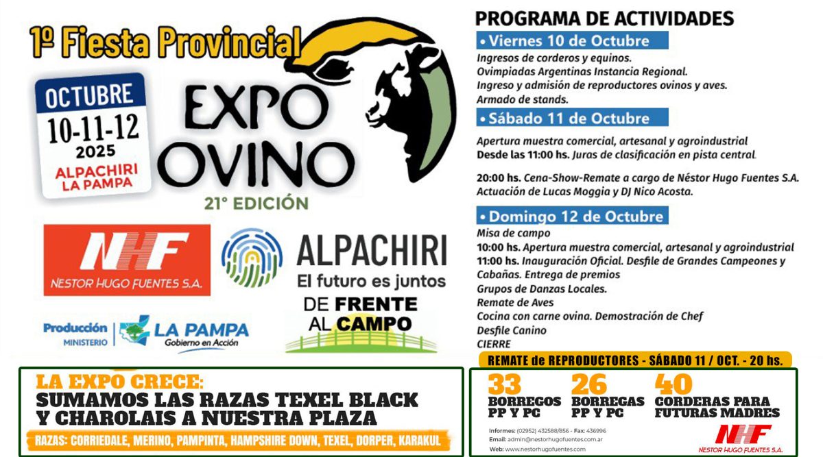 La Expo Ovino 2025 en Alpachiri celebra su 21° edición del 10 al 12 de octubre. Tres días de genética, remates, innovación y la primera Fiesta Provincial del Ovino. ¡No te la pierdas!