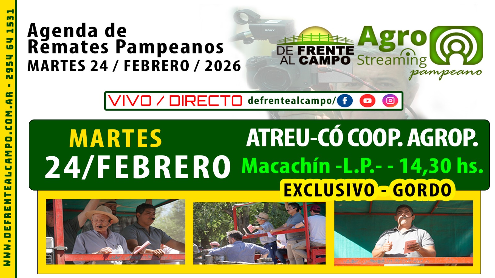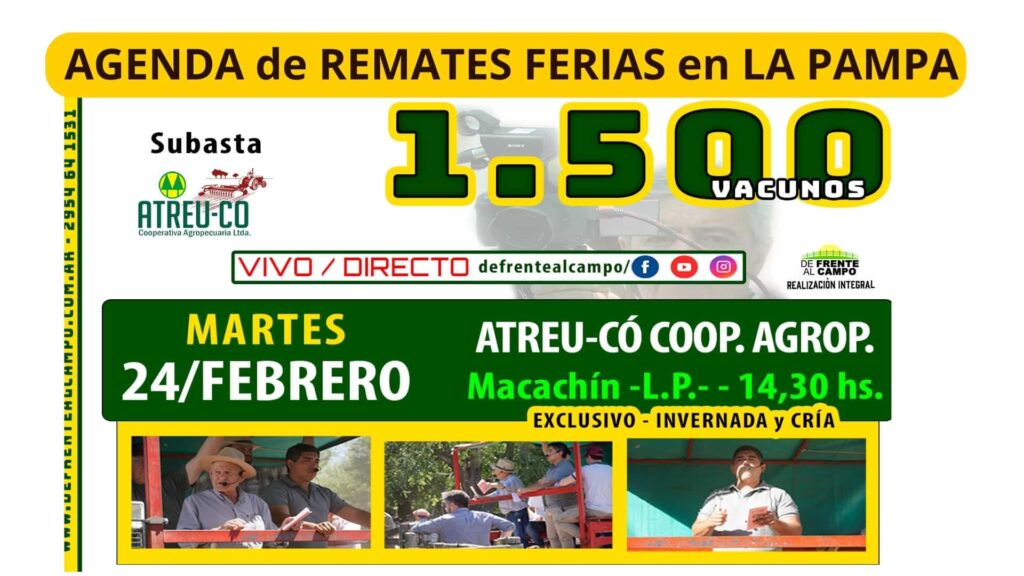 El próximo martes 24 de febrero de 2026 se llevará a cabo un destacado remate feria de invernada de ATREU-CO en la localidad de Macachín, provincia de La Pampa, una cita clave para productores y operadores del sector ganadero regional. La jornada comenzará a las 14:30 horas y contará con hacienda de invernada, consolidando una nueva instancia comercial organizada por la cooperativa.
