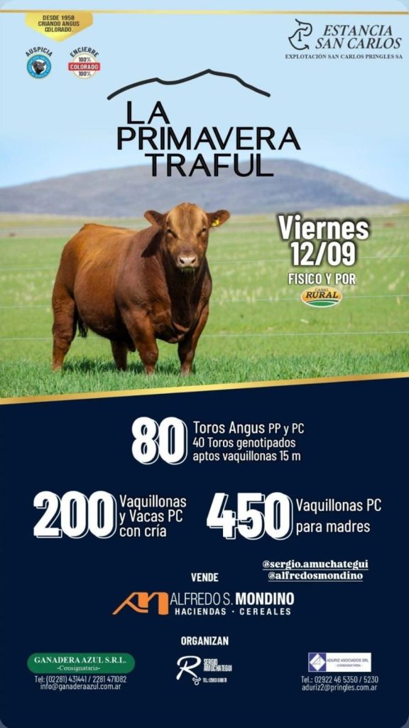 El próximo viernes 12 de septiembre de 2025, en la reconocida Estancia San Carlos, se llevará adelante la Gran Venta Anual de la Cabaña La Primavera Traful, organizada por la consignataria Alfredo S. Mondino. Este remate feria es uno de los más esperados del calendario ganadero, consolidado por su trayectoria y experiencia en Angus Colorado, con más de 59 años de selección genética.
