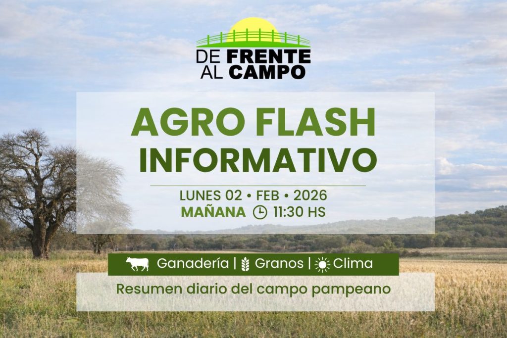 El Agro Flash de Frente al Campo de este lunes 2 de febrero de 2026 ofrece un repaso ágil por la actualidad del sector agropecuario pampeano, con foco en ganadería, agricultura, agenda comercial y clima, para arrancar la jornada bien informados.