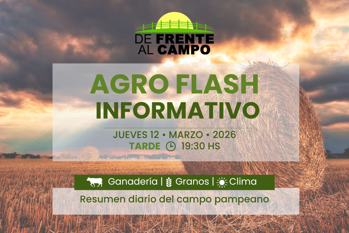 La edición Agro Flash Tarde del jueves 12 de marzo de 2026, el resumen informativo del sector agropecuario pampeano difundido por De Frente al Campo y conducido por el periodista agropecuario pampeano José María García Casarrota, presentó una recorrida rural y agenda de actividad ganadera en la provincia.