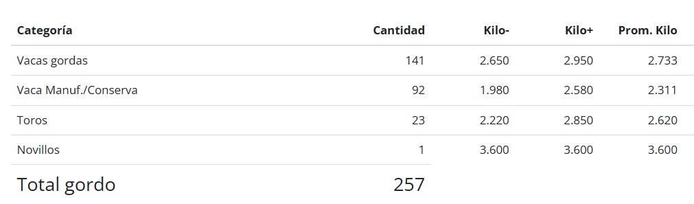 Por el lado de las hembras, las terneras mantuvieron una demanda sostenida, con picos de $6.267,61/kg en el rango de 140 a 160 kg y $6.220,47/kg en las de 120 a 140 kg. Las vaquillonas de 260 a 300 kg promediaron $4.490,57/kg, mientras que las de mayor peso se ubicaron en valores acordes al momento del mercado. En faena, las vacas gordas promediaron $2.733/kg, las vacas manufactura y conserva $2.311/kg, y los toros $2.620/kg, completando una jornada equilibrada en todas las categorías.