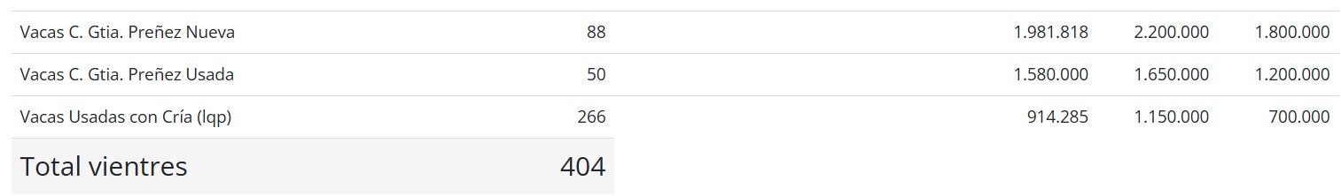 El remate también incluyó categorías de hacienda gorda, donde las vacas gordas promediaron $2.861/kg, con máximos de $3.300/kg, mientras que los toros alcanzaron valores de hasta $3.500/kg. En el segmento de vientres, se destacaron las vacas con garantía de preñez nueva, que llegaron hasta $2.200.000, y las vacas usadas con cría, que marcaron máximos de $1.150.000 por conjunto.