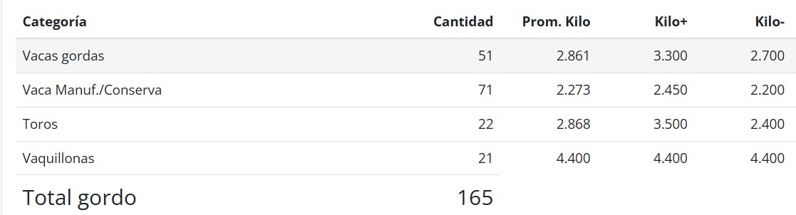 En cuanto a categorías más pesadas, los novillitos de 260 a 300 kilos registraron valores de hasta $5.846,15/kg, mientras que los novillos de más de 400 kilos se ubicaron en torno a $5.000/kg, manteniendo referencias importantes para la reposición.