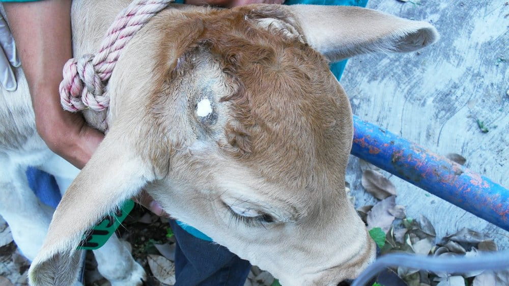 la tradicional práctica de remover los cuernos en los toros o los botones en los terneros, entre la cauterización o el uso de la pasta o crema.
