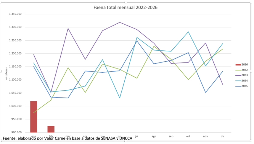 Si bien en el último mes cayó 9% intermensual y tuvo el menor registro en casi 15 años, el número fue afectado por la poca cantidad de días hábiles. De todo modos, en el primer bimestre se registró la marca más baja desde 2016, lo cual permite pensar que el año cerrará con una menor faena que en 2025.