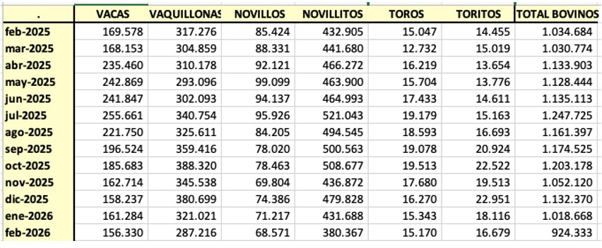 La faena argentina totalizó 924 mil cabezas en febrero.