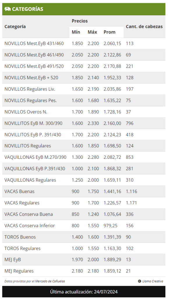 El mercado ganadero de Cañuelas cerró la jornada del miércoles 24 de julio con un balance positivo, reflejando una leve tendencia alcista en los precios de la mayoría de las categorías. Los novillos de exportación, tanto en las categorías más livianas como en las más pesadas (Novillos Mest.EyB 431/460 y Novillos Mest.EyB 461/490), fueron los protagonistas de la jornada, con incrementos en sus valores que impulsaron el índice general del mercado.