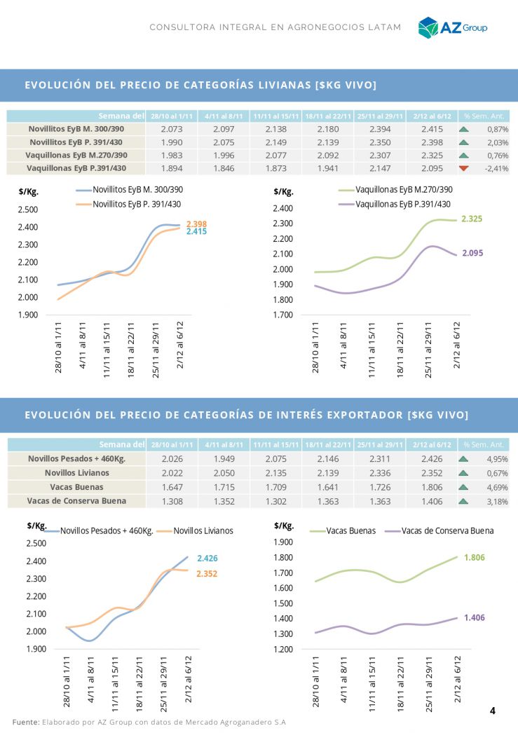 Las hembras de 270/23kg. alcanzaron los $/kg 2.600. Misma variación. Los novillos de 430/460kg subieron $/kg 200 desde el martes, alcanzando hoy los $/kg 2.600. Los de mayor kilaje, entre $/kg 2.500 y 2.550. Variaciones de +9% y +7% respectivamente.