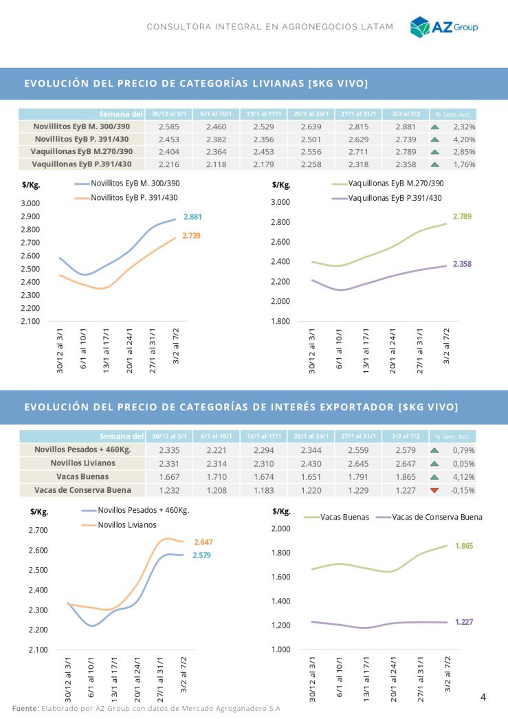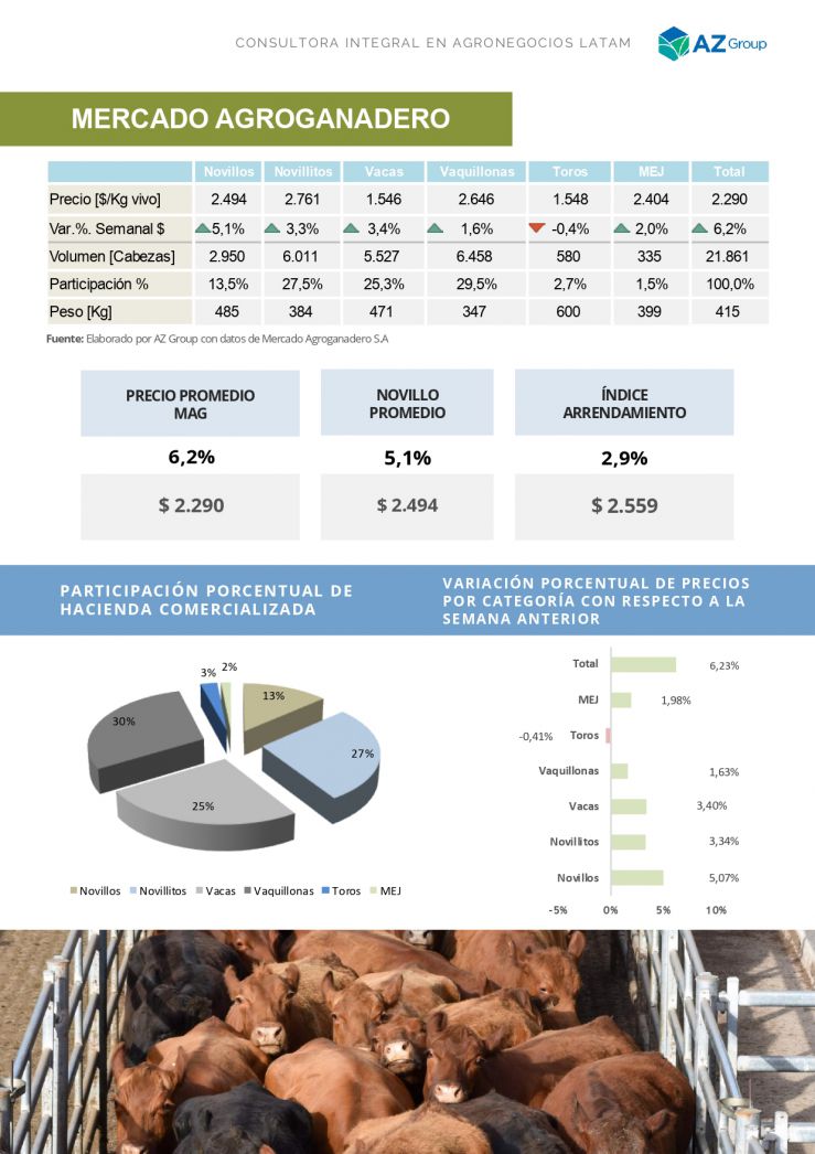 Cierre del mercado con variaciones alcistas para todas las categorías. Se llegó a pagar hasta $3.200/kg. por un lote de vaquillonas livianas. La semana cierra con un volumen que apenas sobrepasó las 20 mil cabezas.