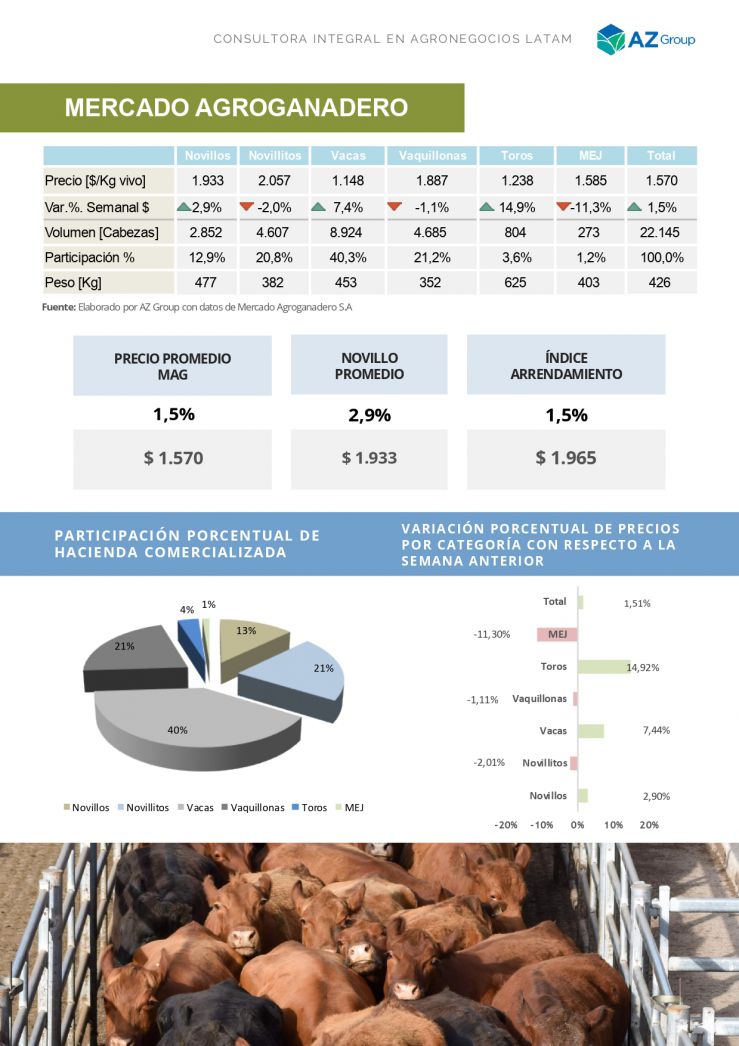 Cierre semanal en el MAG con un nivel total ingresado mayor al de la semana pasada. La oferta de vacas continúa en baja, compensada por el aumento de disponibilidad de novillos, novillitos y vaquillonas.