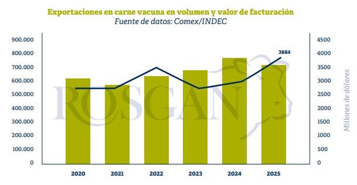 Tomando los datos del INDEC, sin corregir por posibles duplicaciones derivadas del cómputo de huesos con carne, el valor promedio por tonelada de producto embarcado fue de USD 5.444. Este valor, frente a un promedio de USD 3.931 por tonelada registrado un año atrás, representa una mejora interanual del 39% y se ubica entre los niveles más elevados de los últimos años, solo comparable con los registrados en 2022.