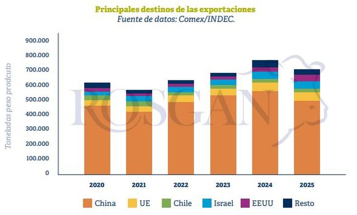 En definitiva, la diversificación de mercados que comienza a registrarse fuera de China permite, no solo reducir la exposición ante eventuales disrupciones comerciales, sino también aumentar el valor de cada tonelada exportada. En 2025, los cinco principales destinos fuera de China —UE, Chile, Israel, EE. UU. y Brasil— representaron el 26% del volumen total embarcado, explicando el 46% de las divisas generadas por el sector. Cada tonelada de carne exportada a estos destinos aportó, en promedio, más de USD9.600, es decir, USD5.800 más que lo generado por cada tonelada enviada a China.