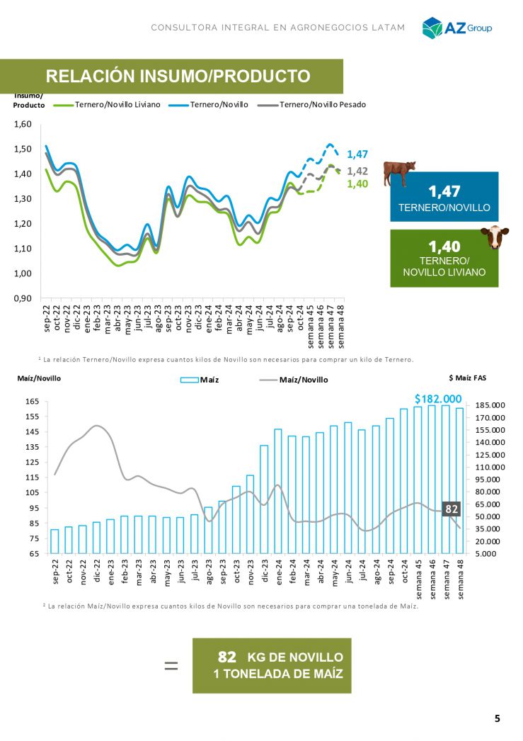 Las relaciones de compra-venta entre terneros y novillos se ajustaron levemente, aunque el diferencial de precios sigue impactando negativamente a los feedlots de consumo y exportación. En contraste, el maíz presenta una buena relación para los engordadores.