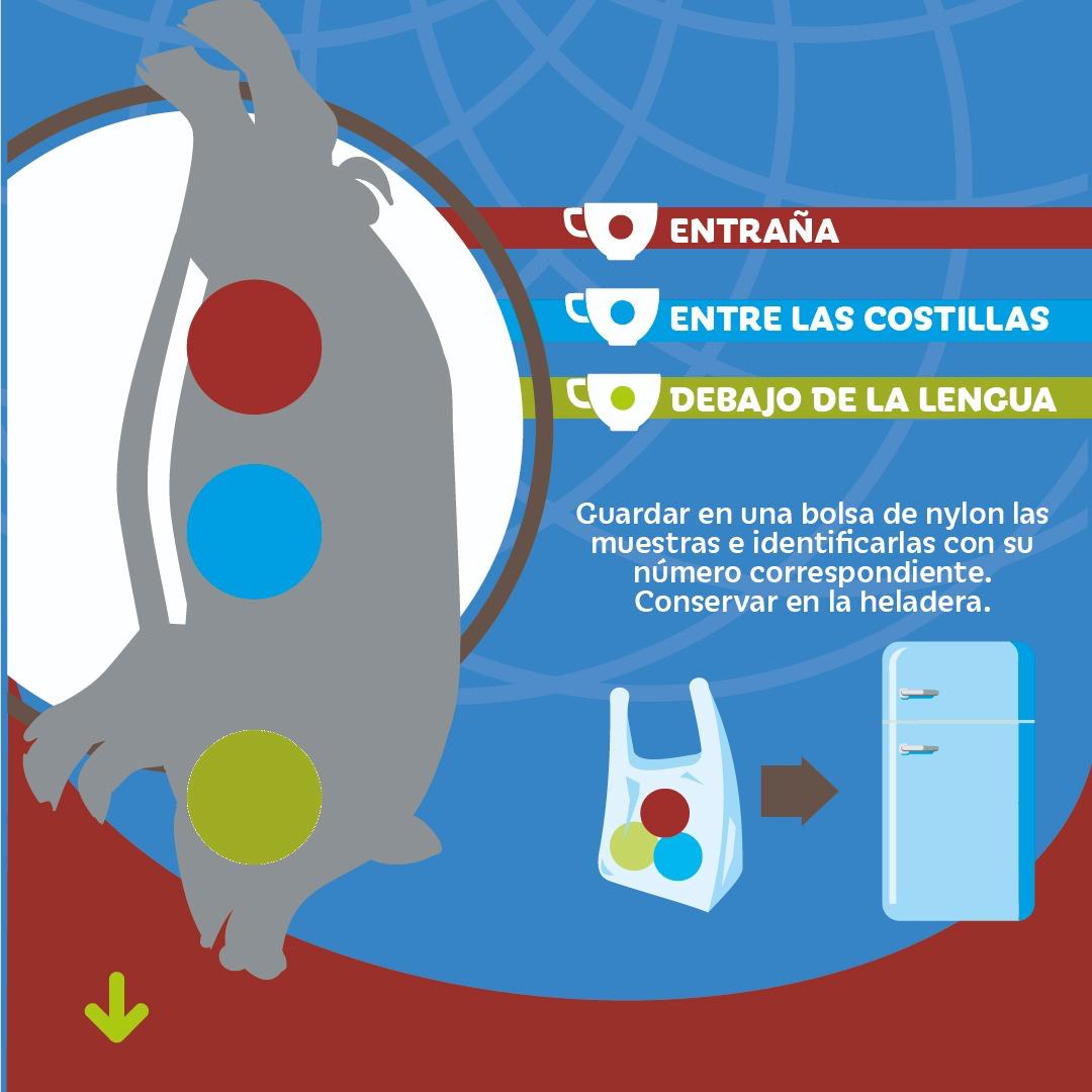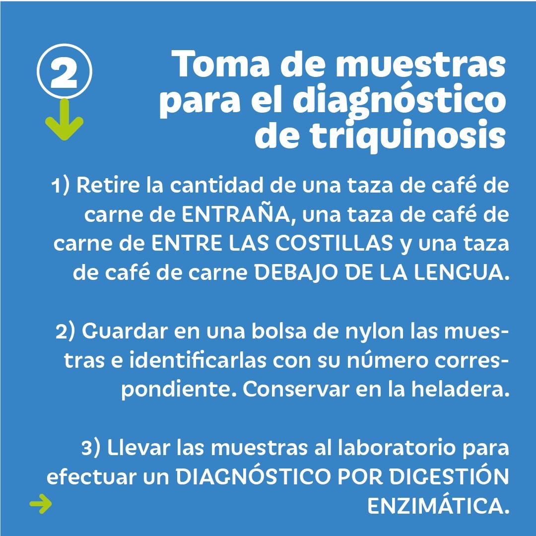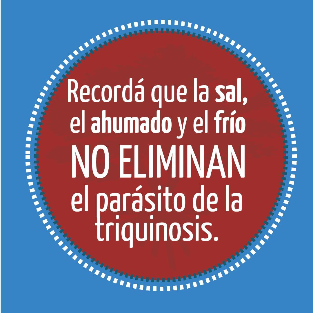 * Al realizar la faena de un cerdo doméstico, jabalí u otra especie silvestre para consumo familiar es importante efectuar el análisis de una muestra de carne (entraña, quijada, intercostales) de cada animal para confirmar la ausencia del parásito que provoca la triquinosis.